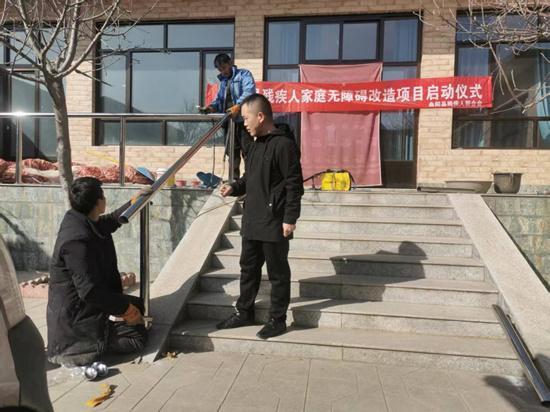 施工人员正在为残疾人家庭安装台阶扶手。李少兰摄